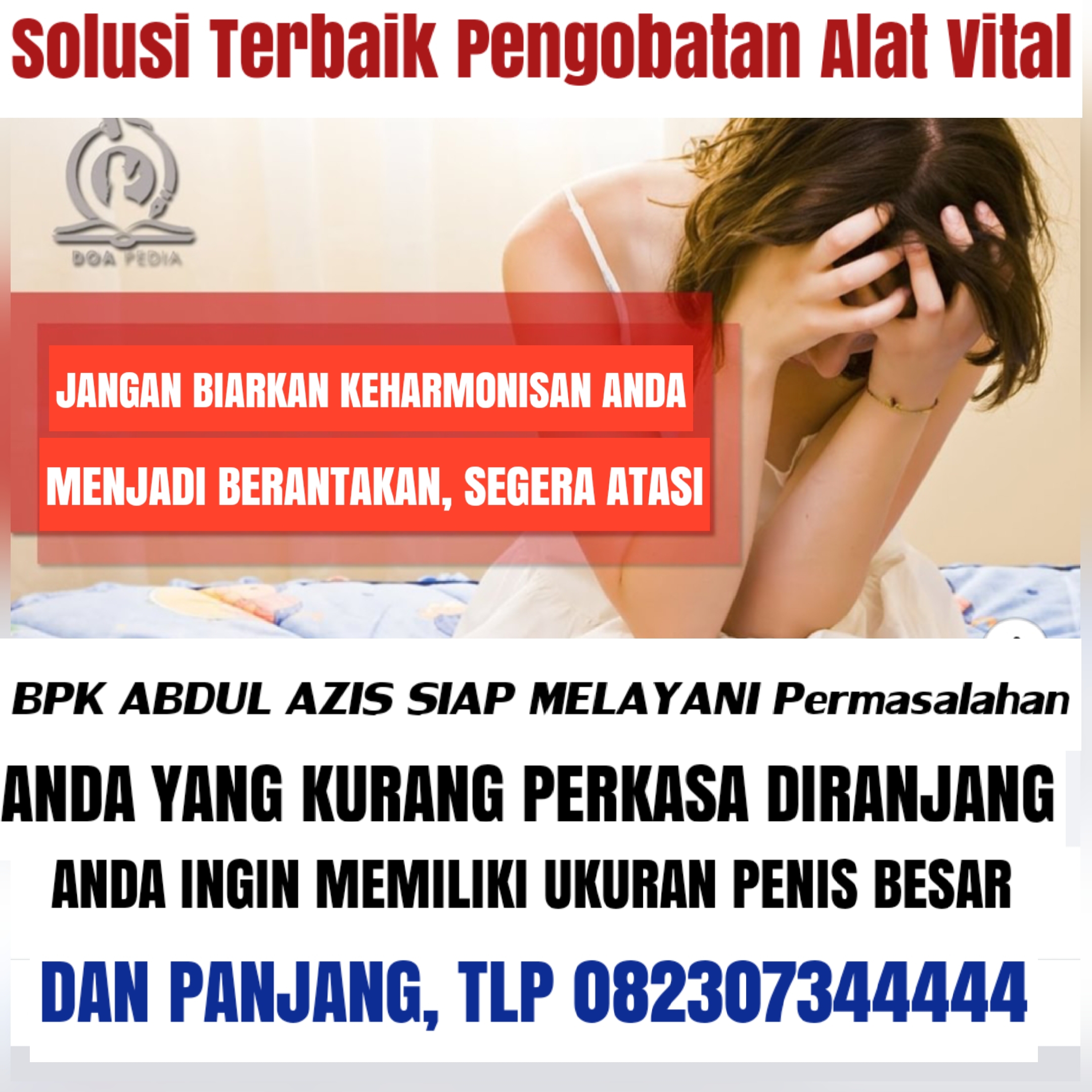 KLINIK Pengobatan Alat Vital BPK. ABDUL AZIS, akan Memberikan solusi yang tepat untuk seluruh permasalahan alat vital Mulai Dari yang Lemah Syahwat, Ejakulasi Dini, Impoten Loyo, Kurang Gairah Dll. sedang anda alami, semua pengobatan tidak menggunakan obat berbahaya yang dapat merusak kesehatan anda. Kami menawarkan pilihan untuk anda yang ingin menambah ukuran alat vital yang anda inginkan, kami tuntaskan dengan memberikan hasil yang permanen seumur hidup.