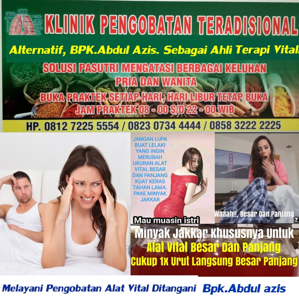 Kami siap memberikan pelayanan dan layaan terbaik untuk masalah vitalitas anda dan tanpa banyak menyita waktu,kami hanya butuh waktu 25 menit ditangani Sampai Maksimal dan tuntas. Tanpa pantangan dan tanpa efek samping karena kami tidak menguunakan suntik Silikon Atau kimia yg berbahaya. Layanan Terapi Kejantanan Pria & Wanita — Pengobatan Tradisional Alat Vital BPK Abdul azis LAYANAN KHUSUS PRIA Memperbesar & Memperpanjang (Permanen) Bikin Keras, Kuat Dan Tahan Lama Disfungsi ereksi Ejakulasi dini/Lemah Syahwat Lemah Karena Diabetes Impotesi /Mati total Tidak Bergairah, dll LAYANAN UKURAN VITALITAS PRIA Panjang 15cm Diameter 3 cm Panjang 16cm Diameter 3 cm Panjang 17cm Diameter 4 cm Panjang 18cm Diameter 4 cm Panjang 19cm Diameter 5 cm Panjang 20cm Diameter 6 cm LAYANAN KHUSUS WANITA Mandul Sulit Dapat Keturunan Memperindah payu dara Vektay Telat Datang Bulan Kewanitaan/Virgin Keharmonisan Rumah Tangga Buka Aura dan lain-lain Apabilah Anda mengalami masalah vitalitas, segera hubungi Klinik pengonatan Kejantanan Segera konsultasikan kepada Ahlinya. TLP.081272255554